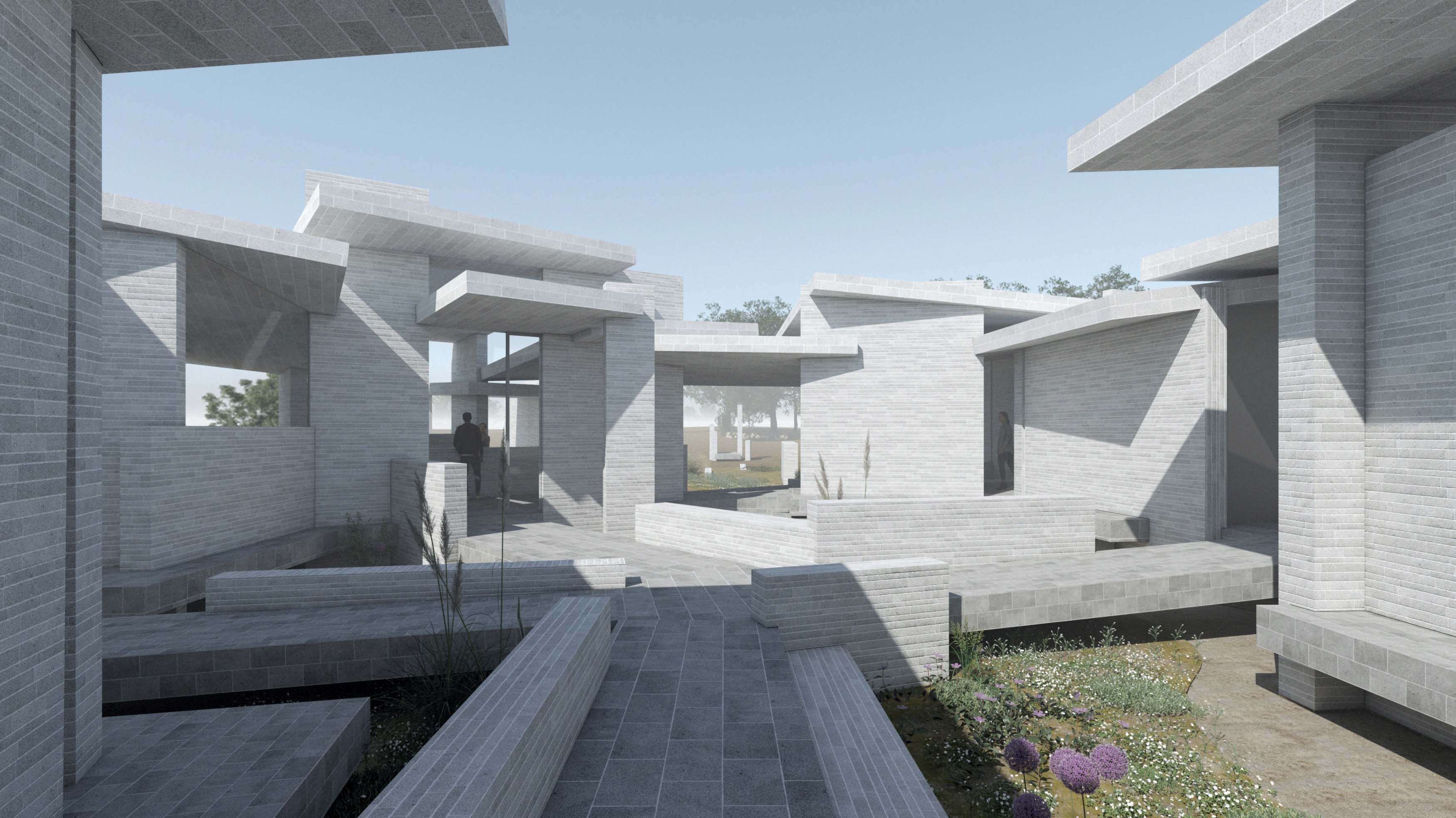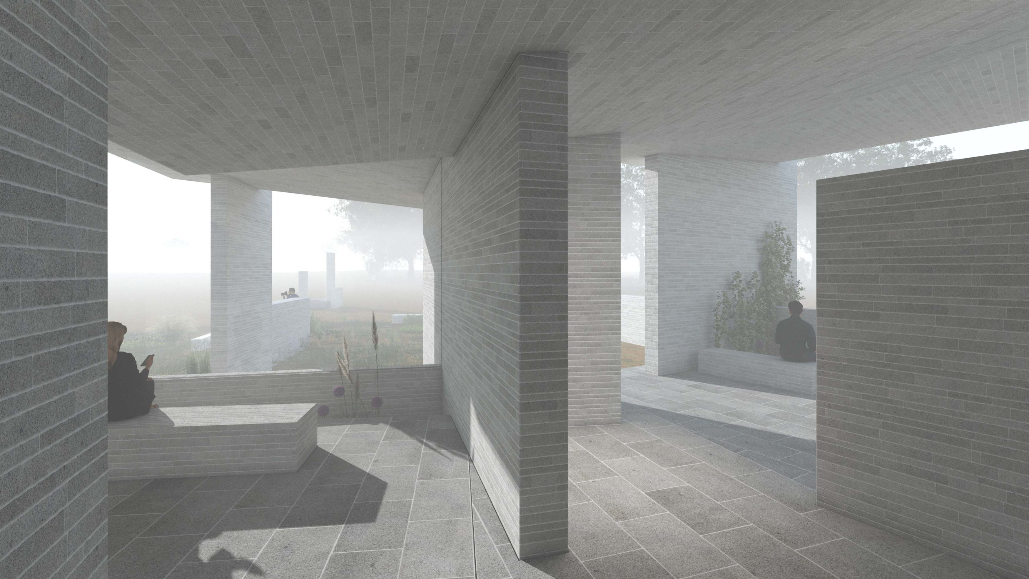 The visitors arrive to the naturum either from north or south. Both of the arrival paths are set between vertical brick elements, between which a meadow-like greenery seems to attempt to spread out over the path and the fields.