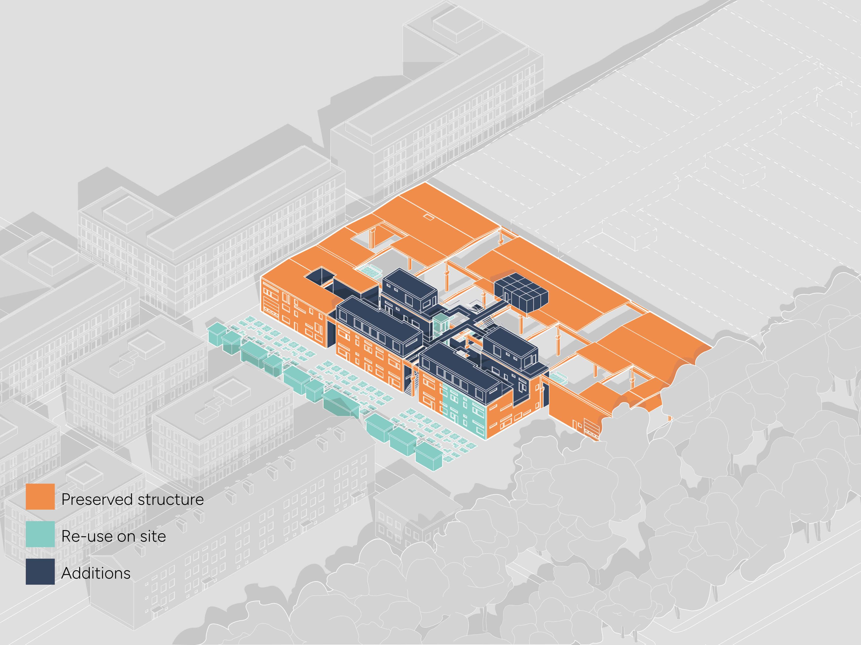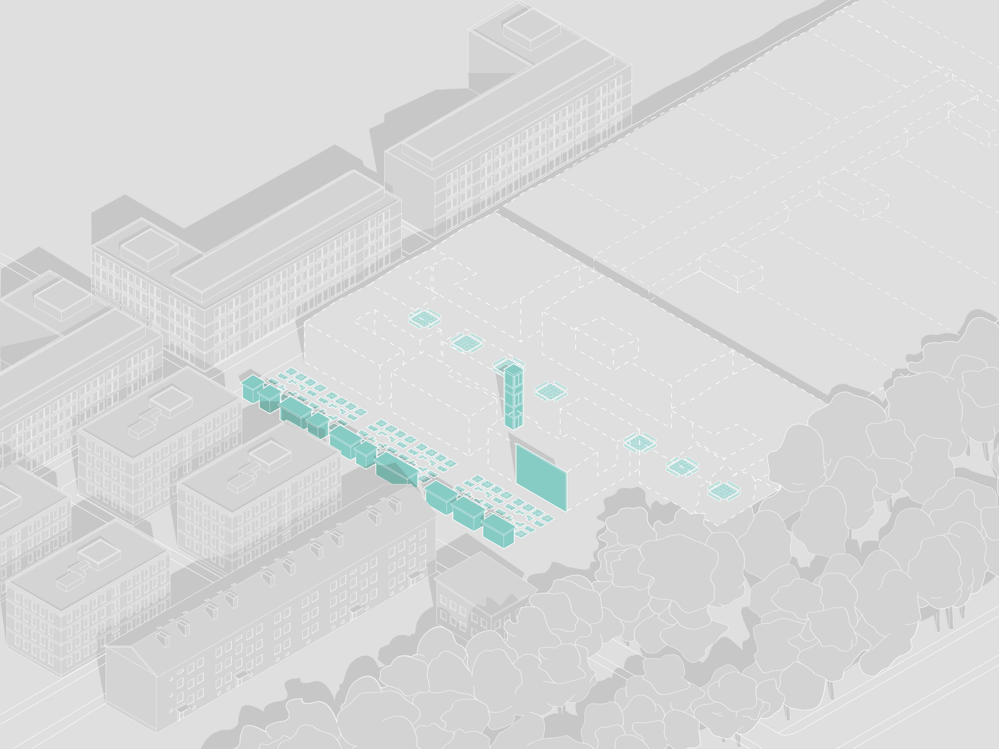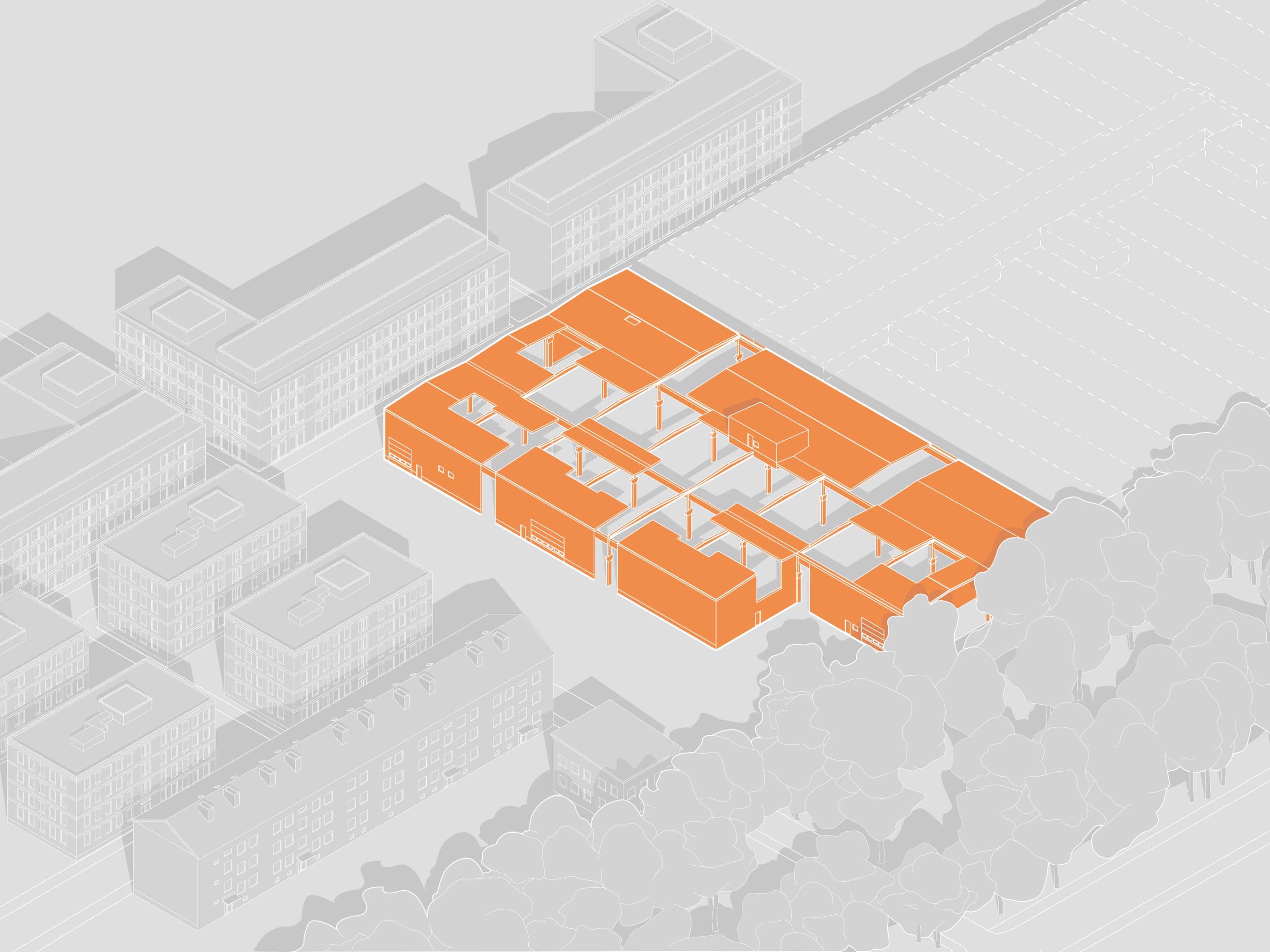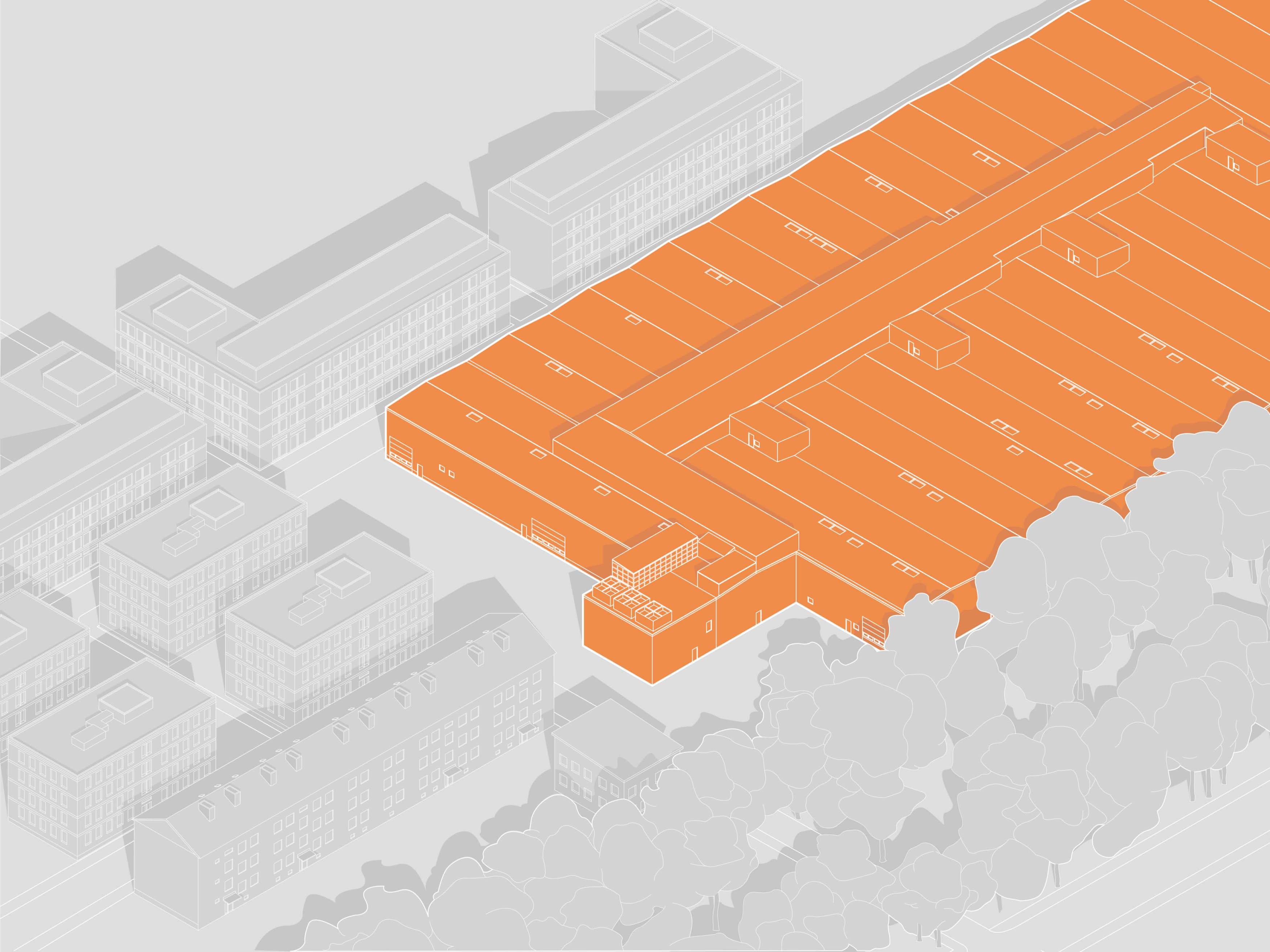This project focuses on a part of Värmeväxlaren 3, which today is a large industrial warehouse in the district of Västerbro in Lund. City plans and strategies from a previous city planning course were used as a basis for this project. The starting point for the city planning project was that Västerbro, due to its central location, would be well suited to become a district with the character of a mixed city with residential, commercial and service functions. For this to be possible, the large-scale industrial blocks and builidngs has to be broken up into smaller units (see site plan). At the same time, it was important to preserve some of the industrial character of the area, in order not to erase its history.