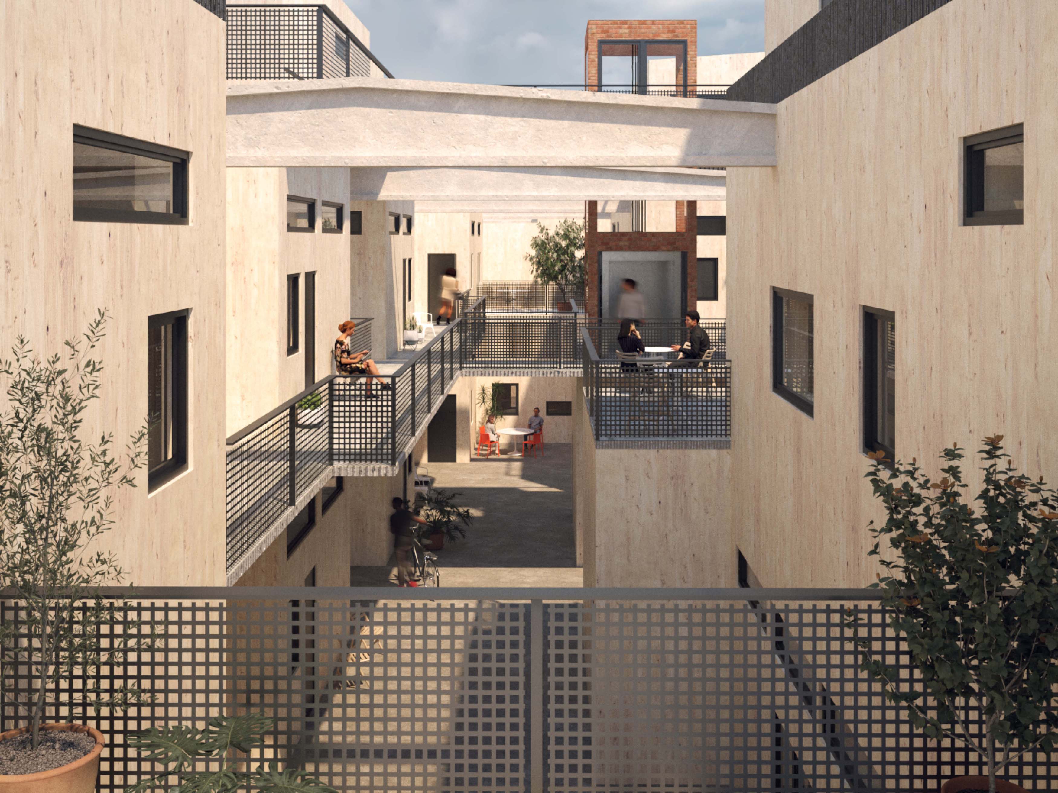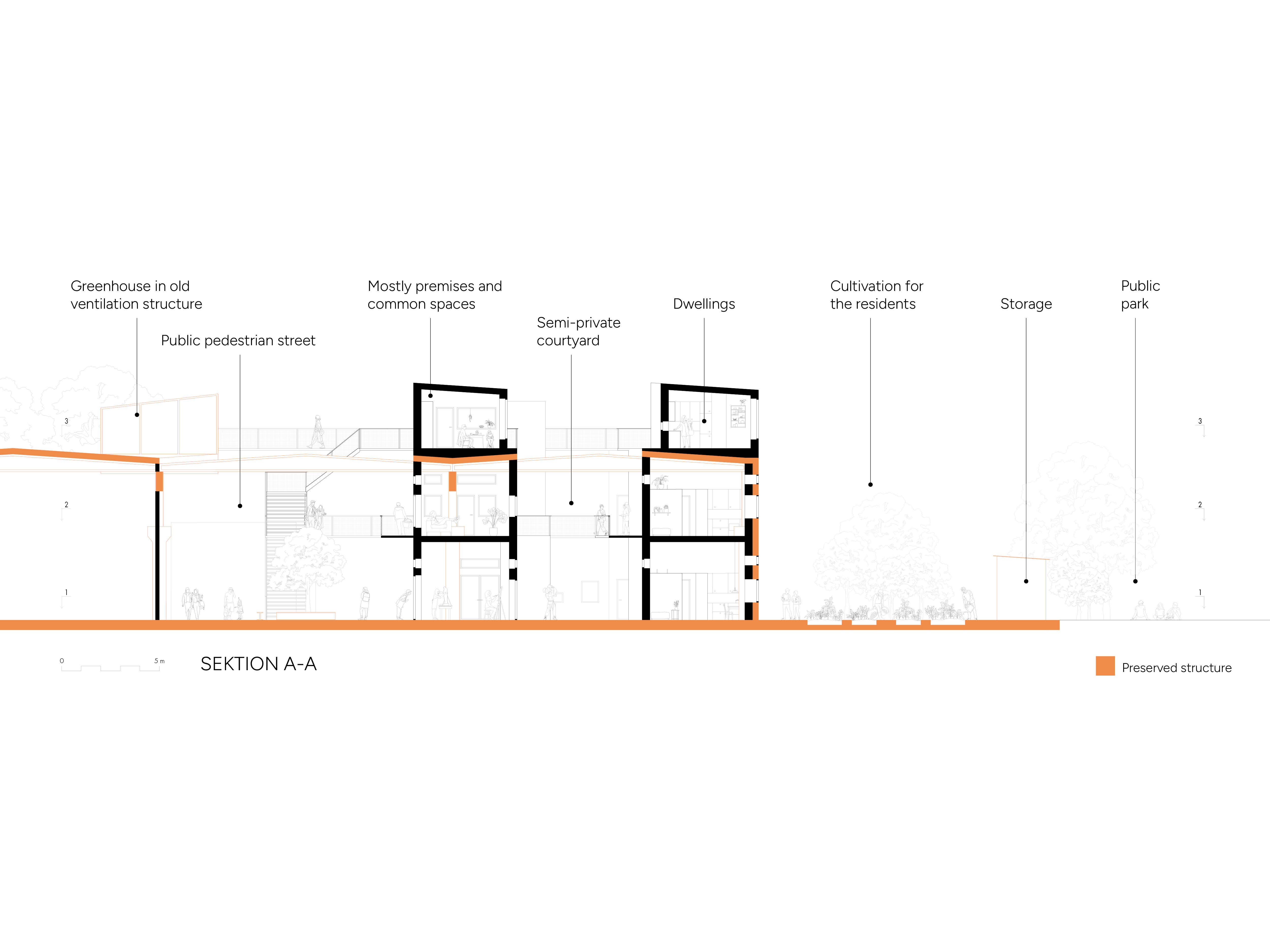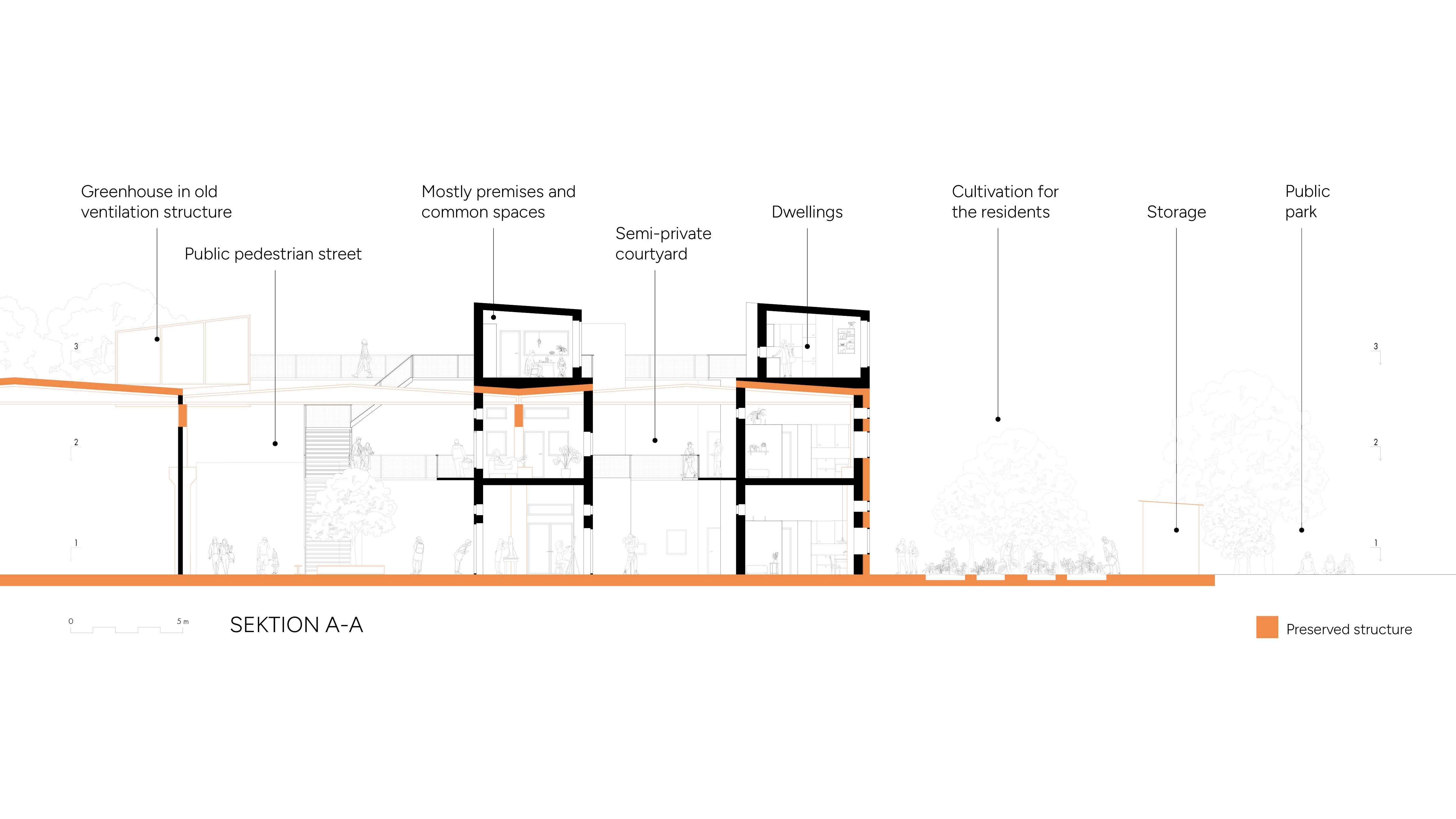An industrial warehouse is transformed into a residential building aimed at a productive lifestyle, with direct access to shared facilities and a living city space. The existing building is re-used as much as possible, for reasons of both ecological sustainability and to preserve the soul of the place. The task was to design dwellings with emphasis on ecological and social sustainability.