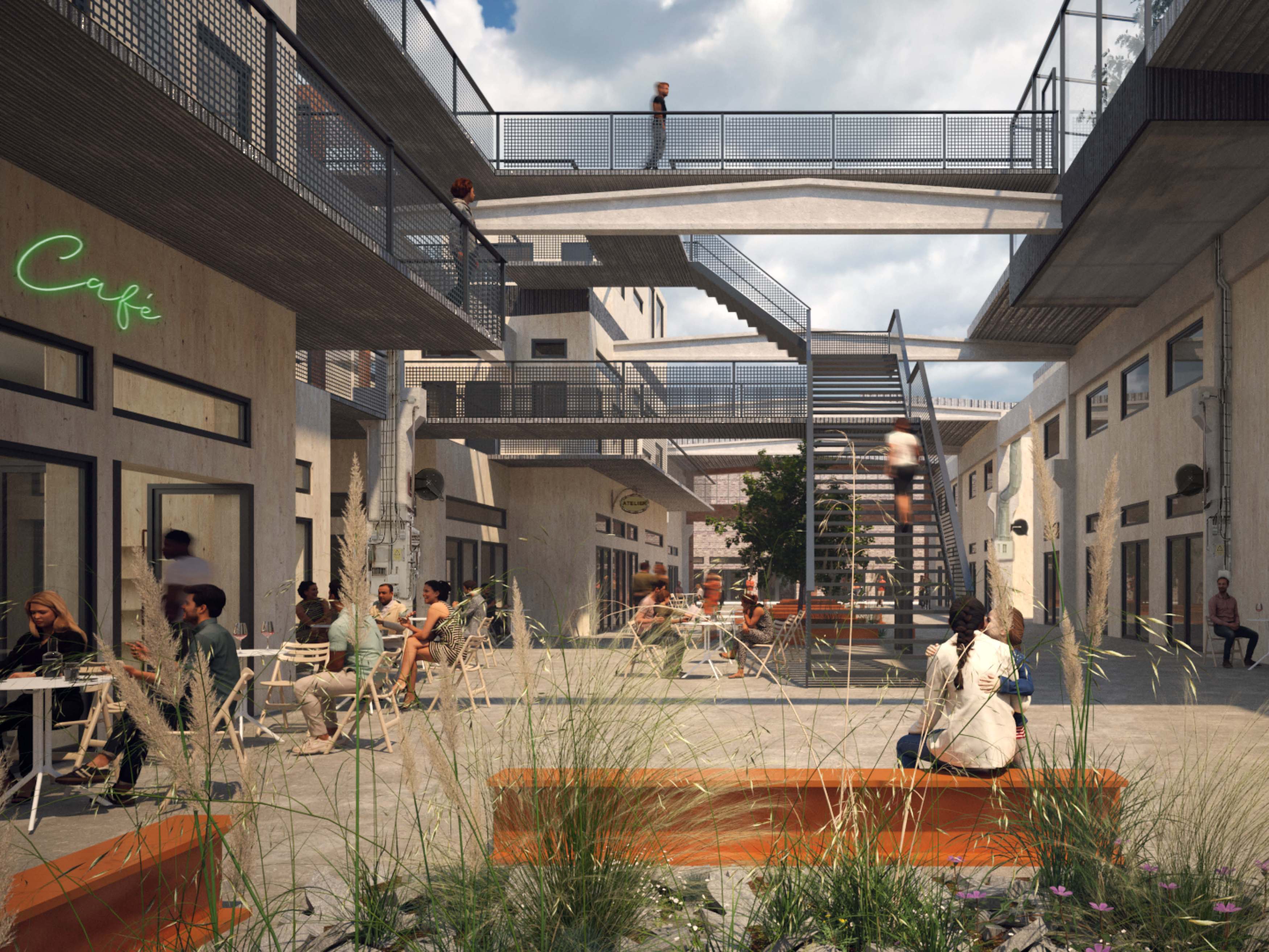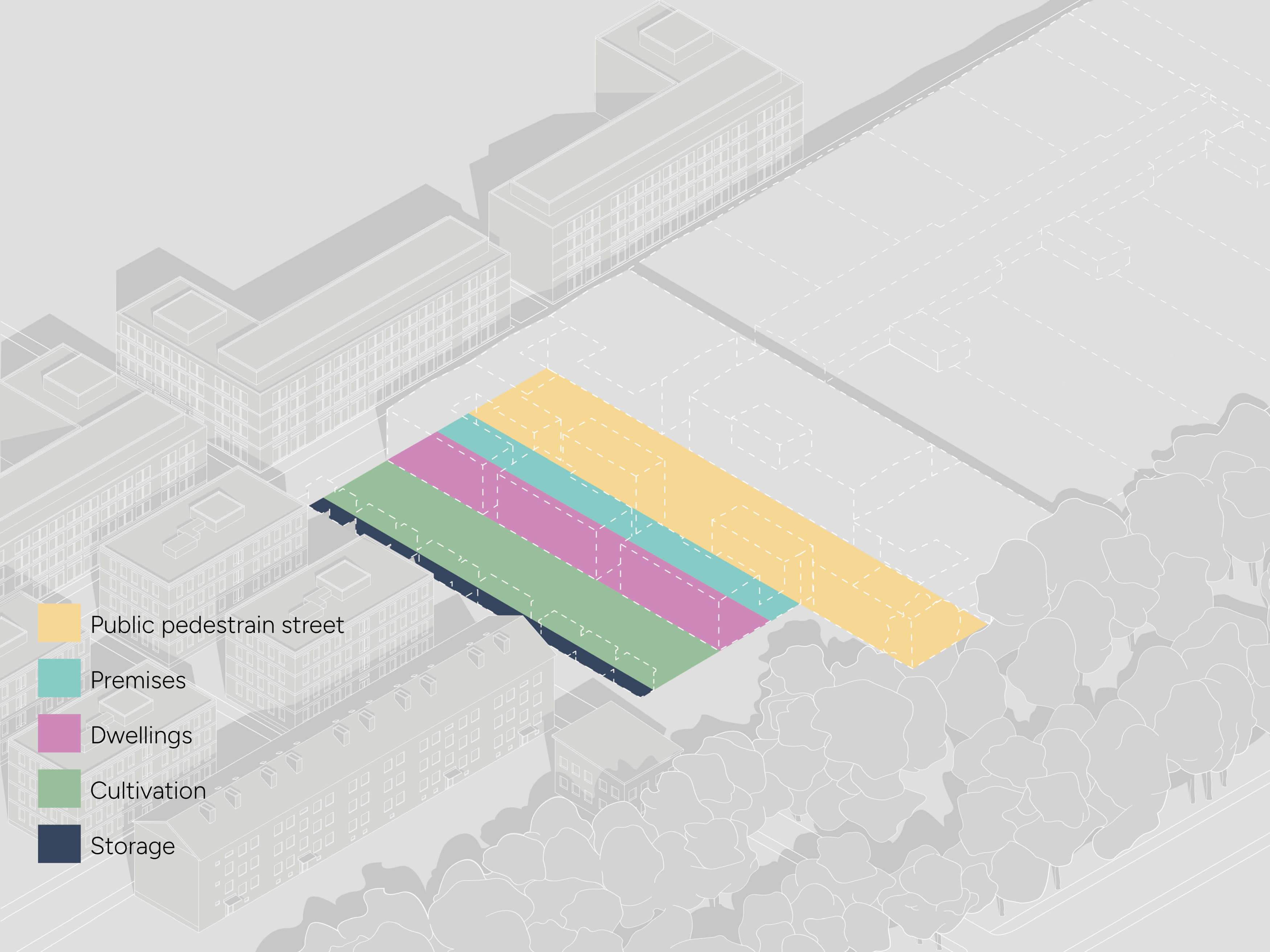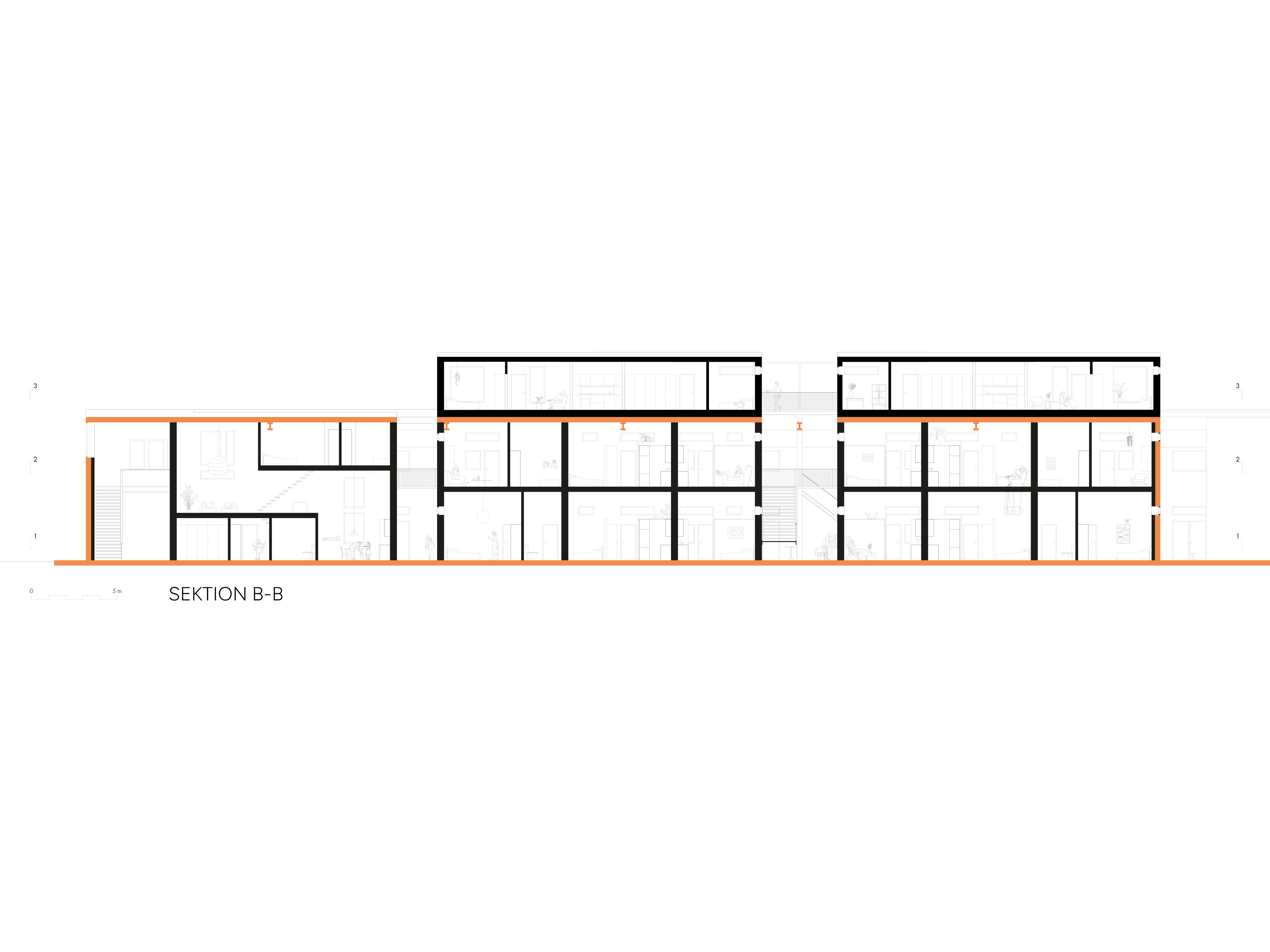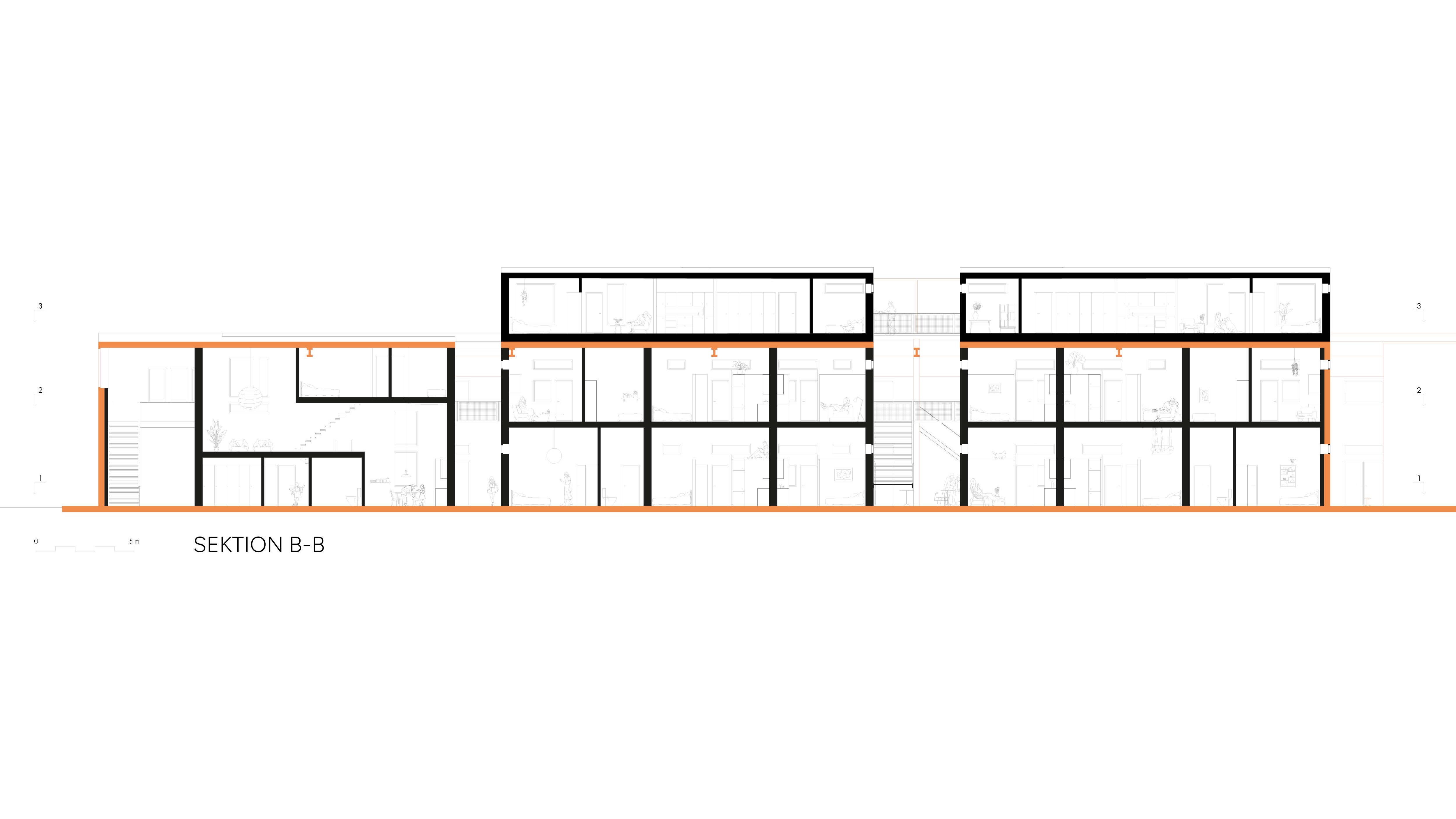 An industrial warehouse is transformed into a residential building aimed at a productive lifestyle, with direct access to shared facilities and a living city space. The existing building is re-used as much as possible, for reasons of both ecological sustainability and to preserve the soul of the place. The task was to design dwellings with emphasis on ecological and social sustainability.